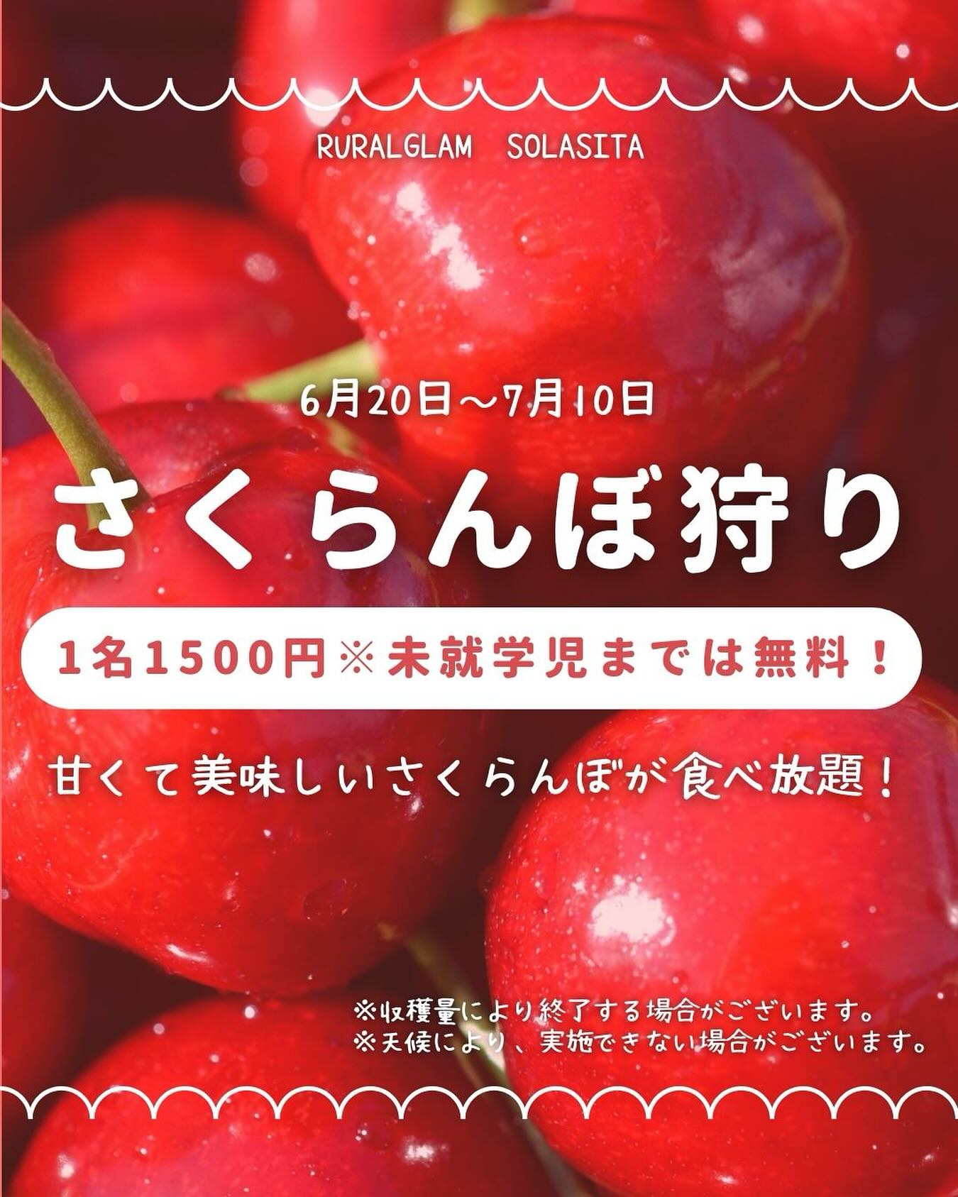 ご注意悪天候時、収穫時期の変動等の理由により、さくらんぼ狩りが実施出来ない場合がございます。